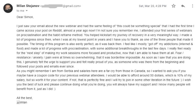The best entry point is my free PDF: 20MinuteMotivation.com (use the code 'friendofsimon', or get the PDF directly here).